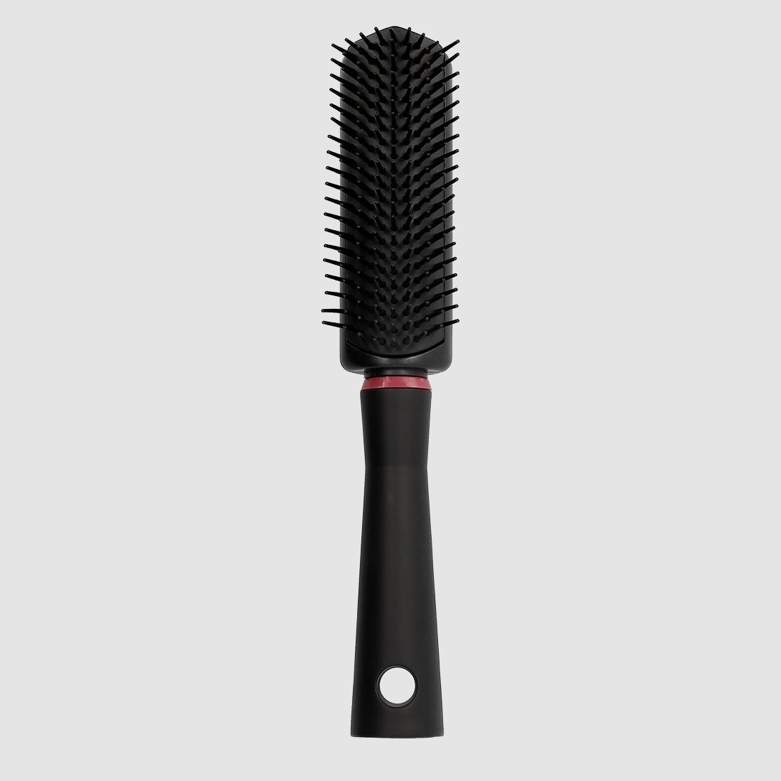 Rectangular cushion brush with soft, flexible pins for gentle detangling and scalp massage. Available with Red or Green cushions.