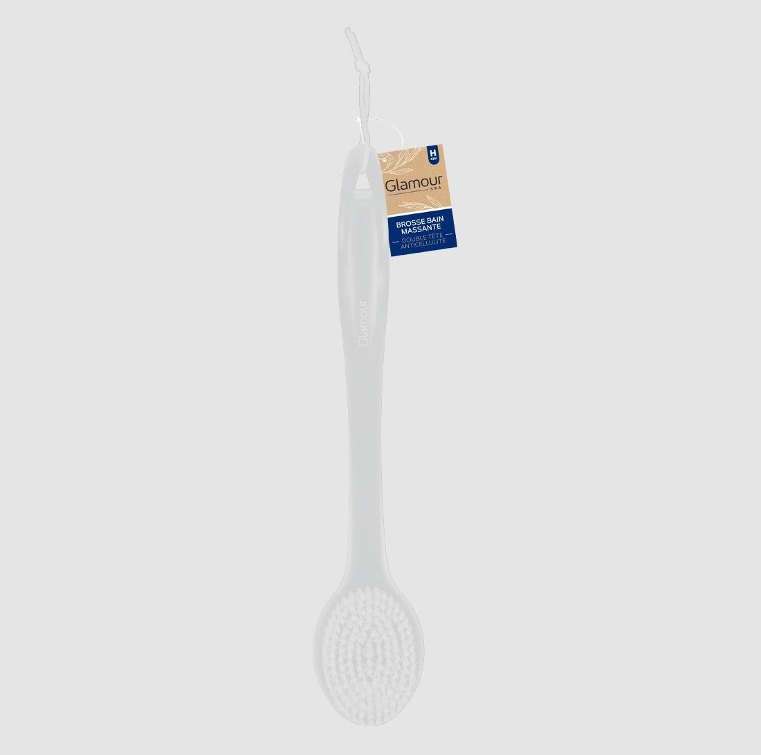 Dual-headed bath brush featuring a massaging side for anti-cellulite treatment and a bristle side for deep cleaning.