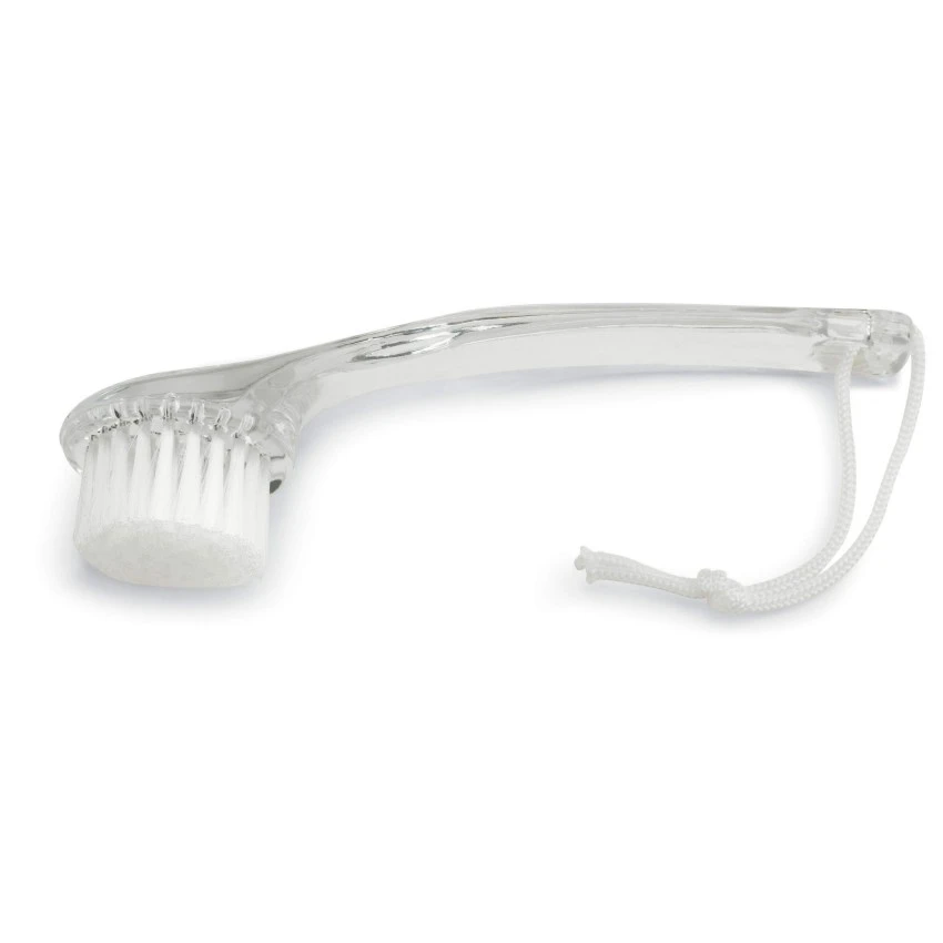 Manual facial brush with soft nylon bristles. Ideal for daily facial cleansing and gentle exfoliation to remove dirt and oil. Includes a plastic cover for hygiene and travel.