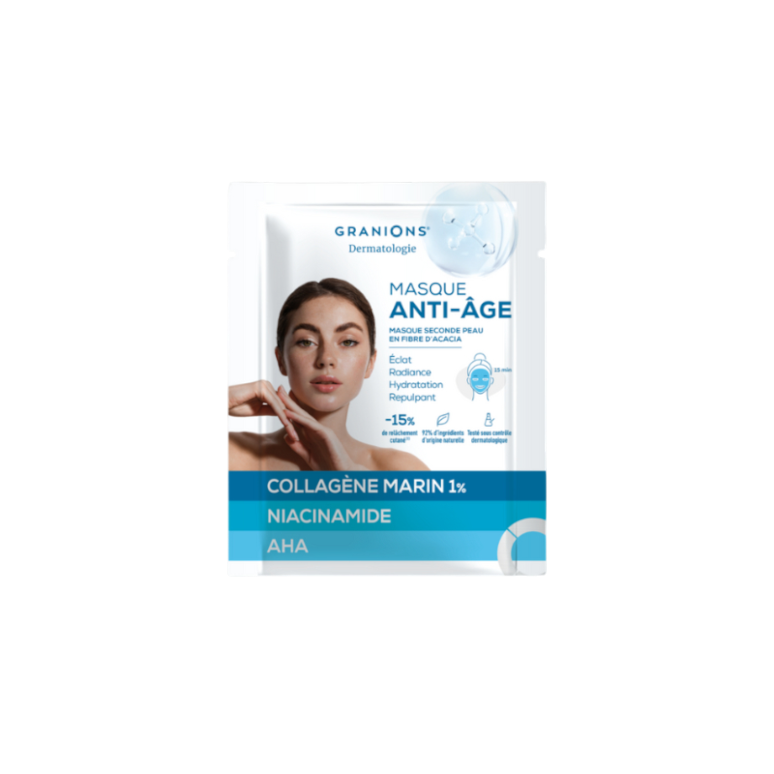 The Granions Dermatology Radiance Anti-Aging Mask is a second-skin tissue treatment designed to provide an instant glow and intense hydration for all skin types. Ideal from the age of 25 as prevention for the first signs of aging, it combines powerful, natural active ingredients in an innovative formula, dermatologically tested.