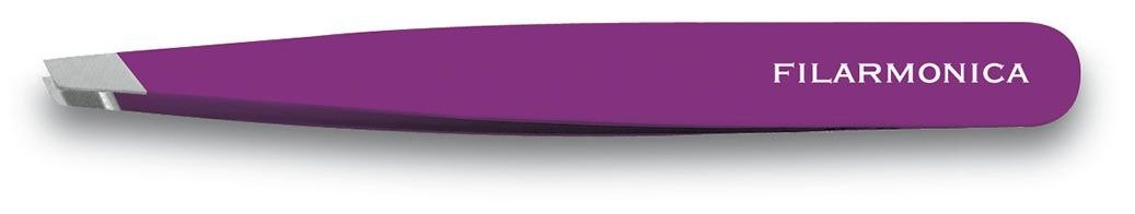 Professional slanted tweezers. The angled tip is perfect for plucking eyebrows and isolating individual hairs with precision. Vibrant purple finish.